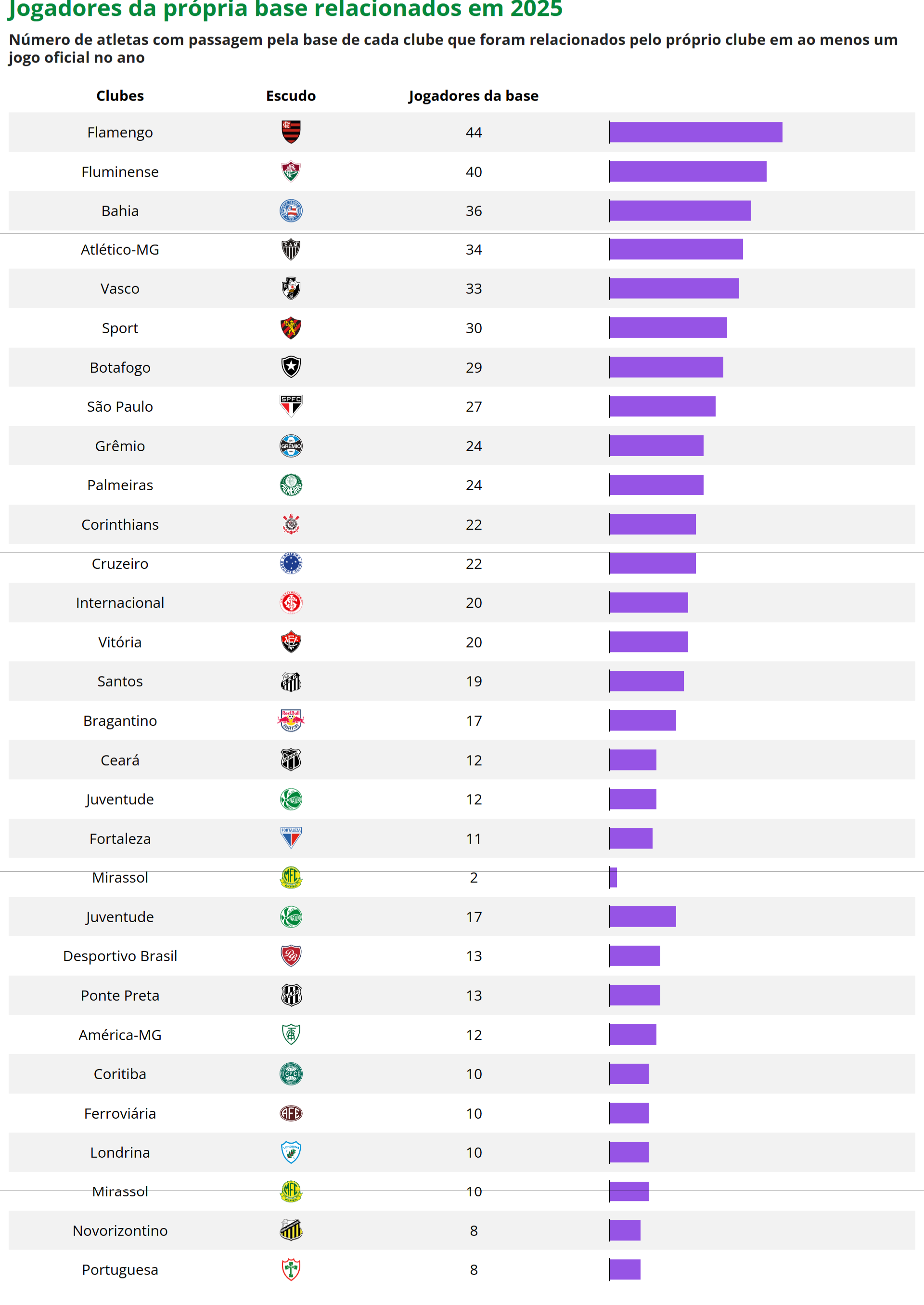 Ceará, Fortaleza e Juventude, que em 2026 vão disputar a Série B, são três das quatro equipes que menos relacionaram atletas de suas bases para jogos. A exceção é o Mirassol, time que menos usou a base, mas que teve um ano histórico, com sua primeira participação na Série A e classificação para a Libertadores. Já o Sport, time de pior campanha no Brasileirão, foi a sexta equipe que mais levou para jogos atletas com passagem por sua base.