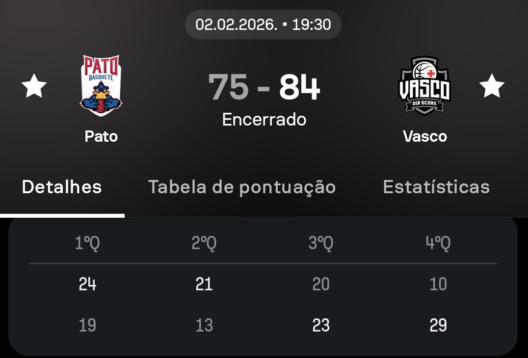 O primeiro período teve duas equipes trilhando caminhos distintos para pontuar. O Pato Basquete fez do garrafão sua principal arma e foi extremamente eficiente perto da cesta, com 88,9% de aproveitamento, compensando a produção abaixo do perímetro. Do outro lado, o Vasco da Gama apostou na bola longa, converteu 44,4% das tentativas de três pontos e conseguiu se manter no jogo mesmo com menor volume ofensivo. Executando melhor o plano, a equipe paranaense fechou o quarto inicial em vantagem: 24 a 19.
