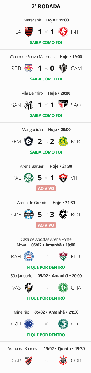 Seis jogos abriram a 2ª rodada do Campeonato Brasileiro nesta 4ª-feira. O Vasco enfrenta a Chapecoense nesta 5ª-feira, às 20h, em São Januário.