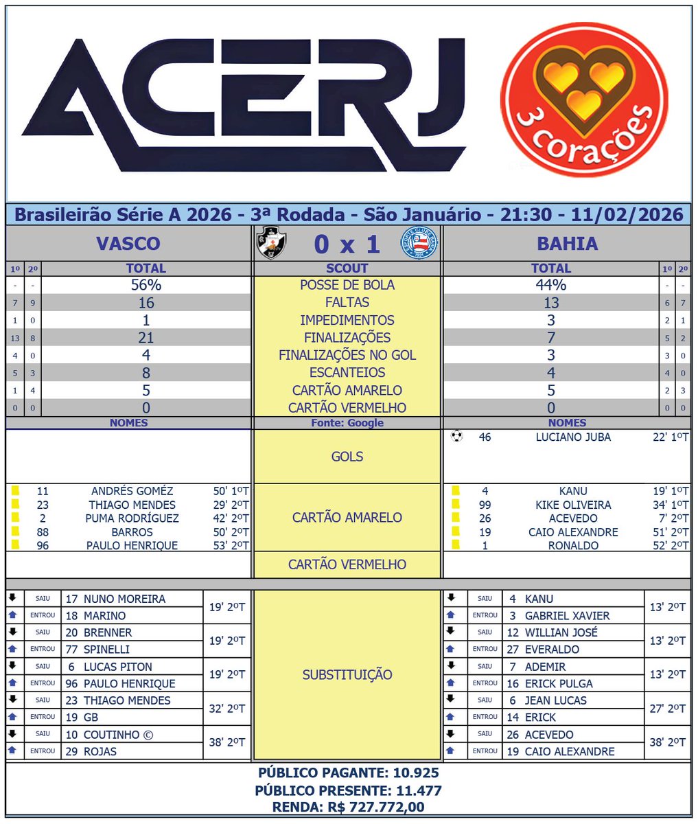 Na noite desta quinta-feira, o Bahia visitou o Vasco no Estádio Vasco da Gama (São Januário) e saiu com uma vitória importante por 1 a 0, em partida válida pela terceira rodada do Campeonato Brasileiro de 2026. O único gol do jogo foi marcado por Luciano Juba, em uma bela jogada de escanteio ensaiado.