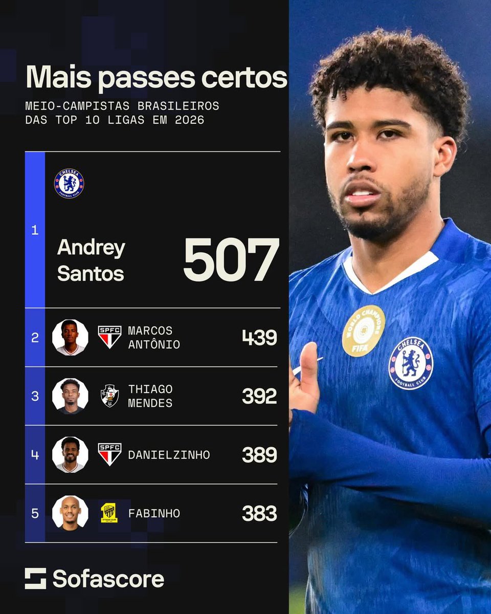 Thiago Mendes é o 3º meio-campista brasileiro com mais passes certos em 2026 nas maiores ligas do mundo; Andrey Santos lidera