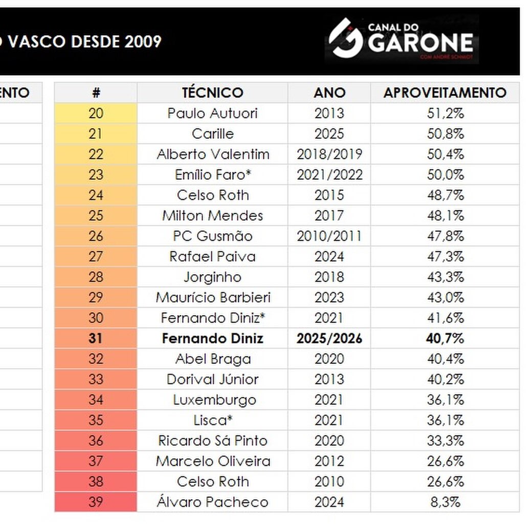 Diniz deixa o Vasco com o 31º PIOR aproveitamento entre os últimos 39 trabalhos de um treinador do clube. Rendimento foi inferior inclusive ao de sua primeira passagem por São Januário.