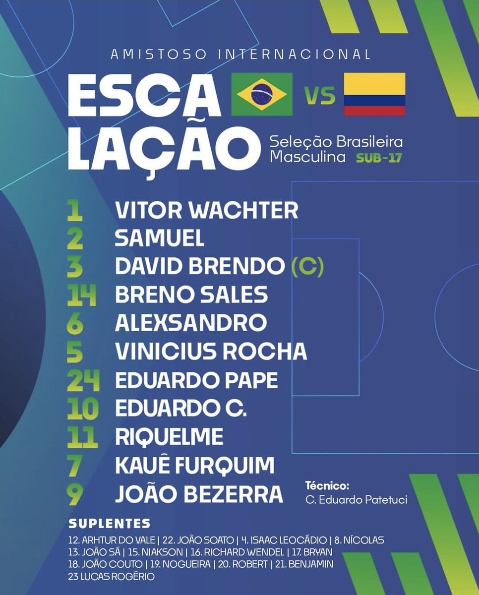 Zagueiro Breno Sales será titular da Seleção Brasileira Sub-17 no amistoso hoje, às 20h30, com a Colômbia, em Barranquilla. O jovem da base do Vasco tem 16 anos e foi titular do Sub-20 na vitória por 3 a 2 sobre o Athletico-PR, na última sexta. Olho nesse garoto, hein...