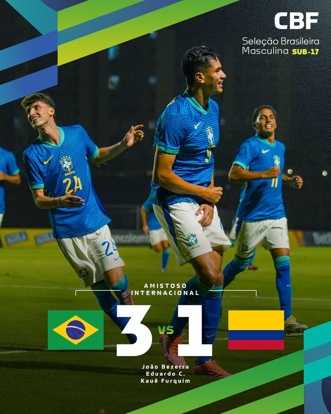 A Seleção Brasileira Masculina Sub-17 venceu a Colômbia por 3 a 1, em amistoso disputado em Barranquilla. Gols de João Bezerra, Eduardo Conceição e Kauê Furquim garantiram a vitória da Amarelinha sobre os donos da casa! ⭐🇧🇷