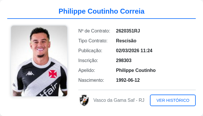 02/03/26 - Rescisão de Philippe Coutinho ainda não foi publicada no Bira da Ferj nem no BID da CBF