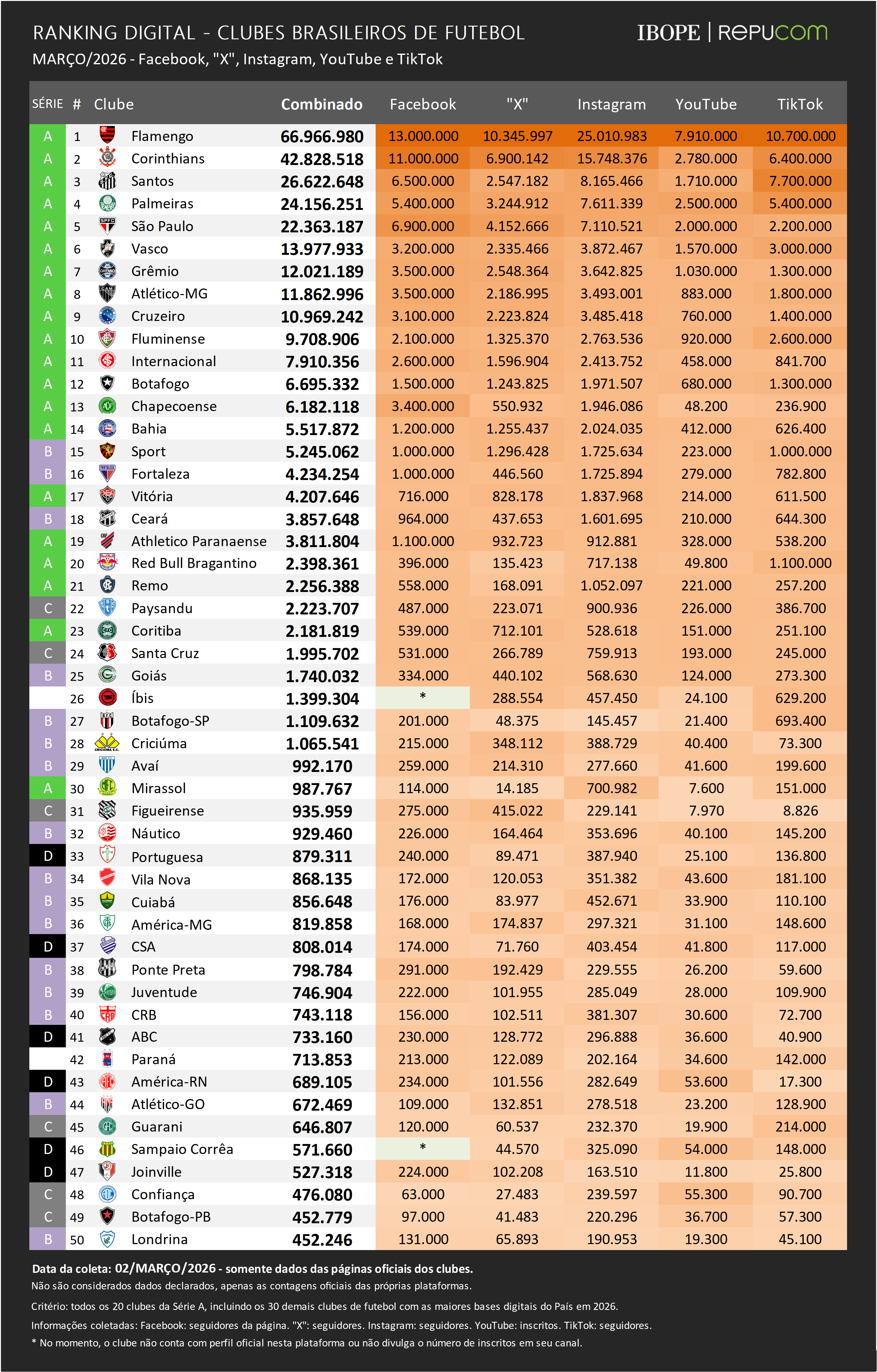 Na edição atual do Ranking Digital dos Clubes Brasileiros do IBOPE Repucom, destacam-se os resultados de Santos, Corinthians, Flamengo, Palmeiras e Grêmio. Estes cinco foram os que registraram os maiores saldos de inscrições em suas redes sociais em fevereiro ao somarem, juntos, mais de 1,1 milhão de novas inscrições.