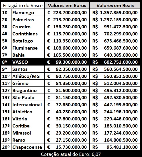 🚨 VASCO possui o 8° elenco mais caro entre os 20 clubes do Campeonato Brasileiro.