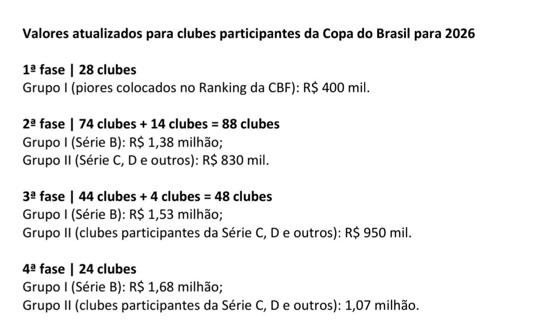 Confira os valores de premiação para o avanço de cada fase da Copa do Brasil 2026