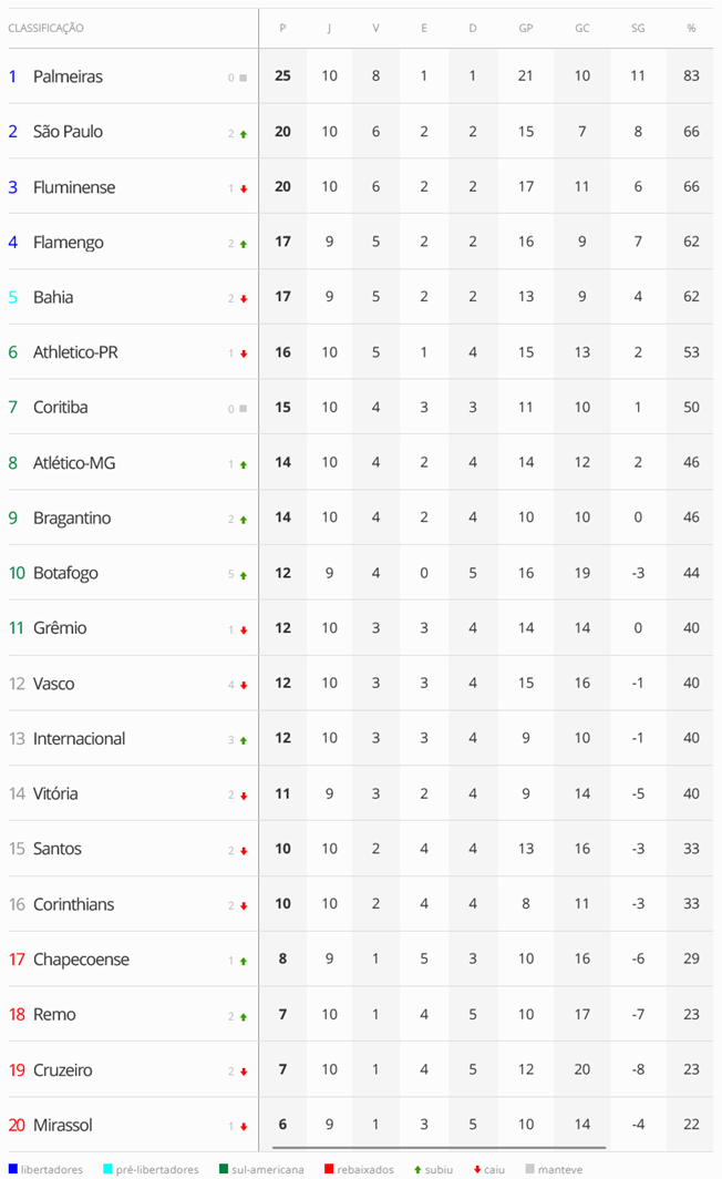 Terminada a 10ª rodada do Campeonato Brasileiro, o Vasco, que perdeu para o Botafogo por 2 a 1, está na 12ª colocação. O Gigante da Colina está a 5 pontos do G5 e a 4 pontos do Z4. Seis times têm um jogo a menos do que os demais participantes.