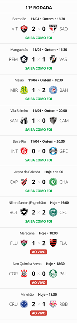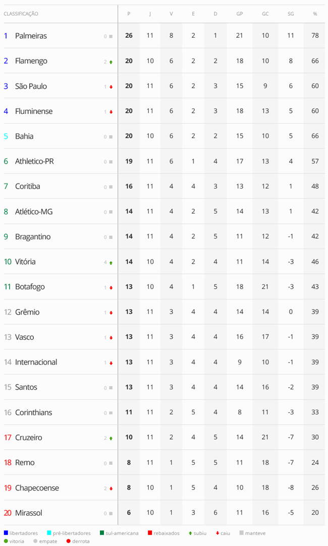 Terminada a 11ª rodada do Campeonato Brasileiro, o Vasco, que empatou com o Remo por 1 a 1, está na 13ª colocação.
