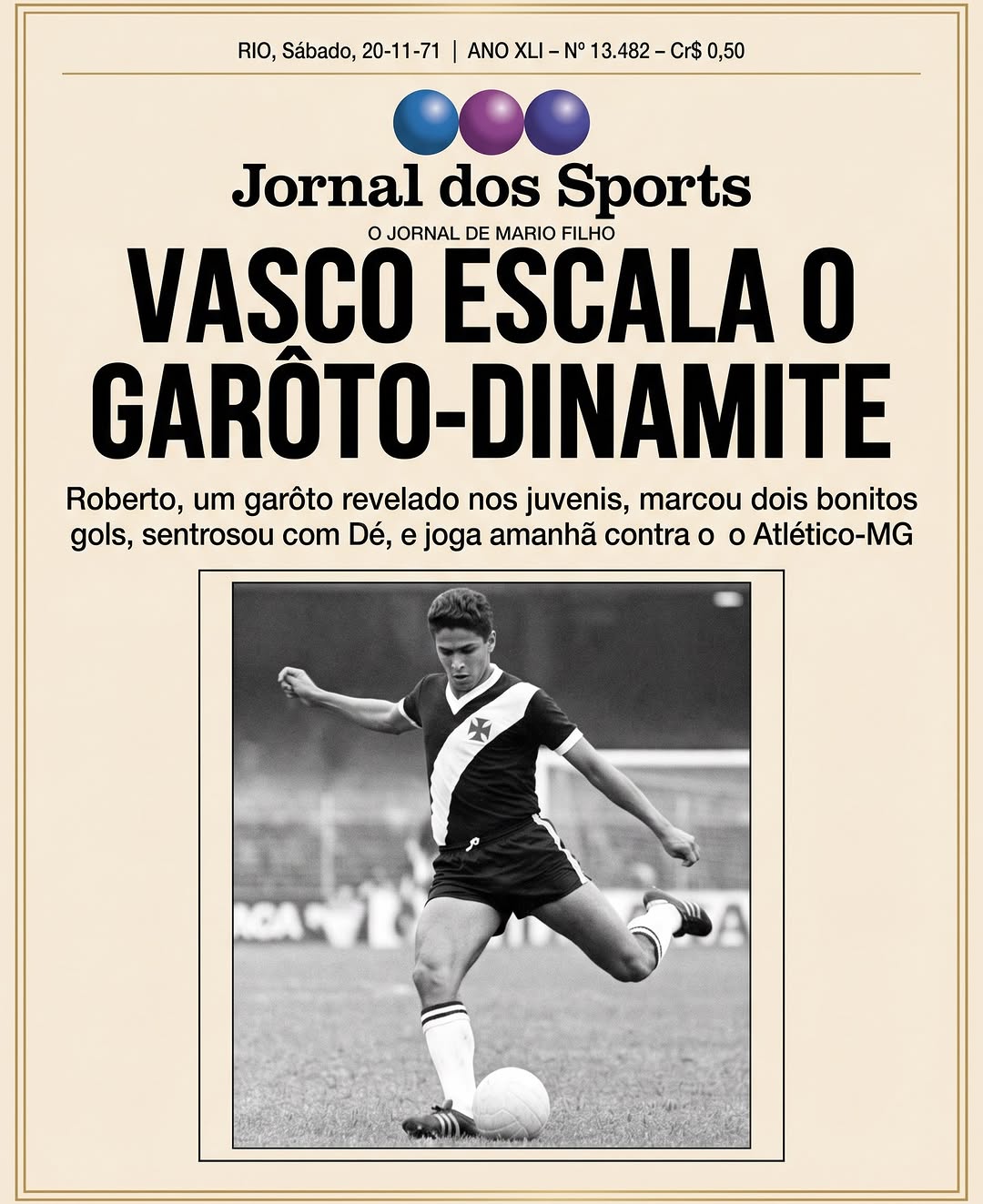Mas a história tem um detalhe que poucos lembram: o apelido, na verdade, surgiu uma semana antes! Em um treino do Vasco, Roberto marcou dois gols que garantiram sua escalação contra o Atlético-MG. A explosão de talento já era evidente, e a consagração oficial veio na rodada seguinte, diante do Colorado.