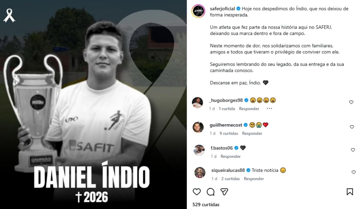 "Hoje nos despedimos do Índio, que nos deixou de forma inesperada. Um atleta que fez parte da nossa história aqui no SAFERJ, deixando sua marca dentro e fora de campo. Neste momento de dor, nos solidarizamos com familiares, amigos e todos que tiveram o privilégio de conviver com ele. Seguiremos lembrando do seu legado, da sua entrega e da sua caminhada conosco. Descanse em paz, Índio", informou o comunicado da Saferj.