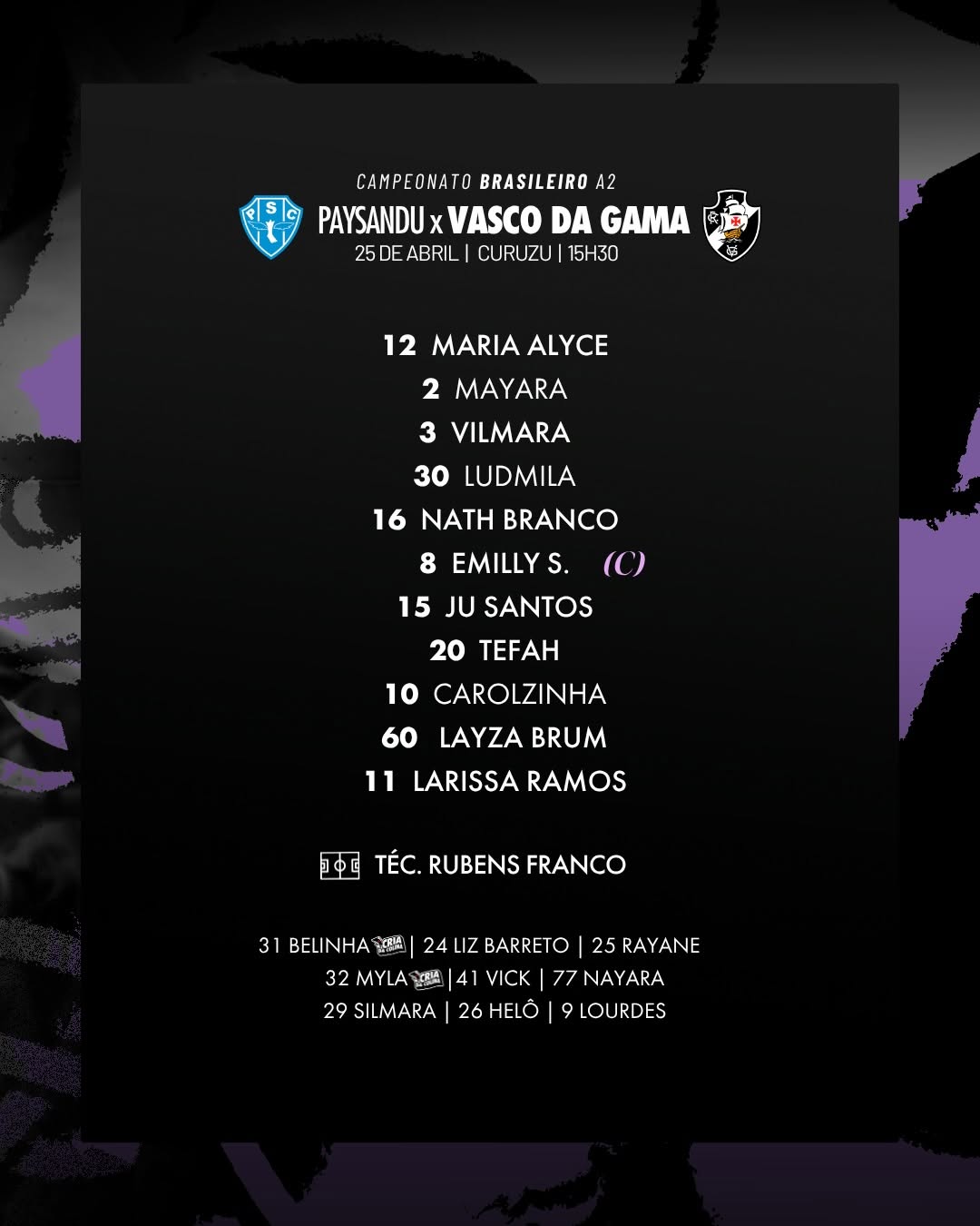 Feminino: Confira a escalação do Vasco para o jogo contra o Paysandu