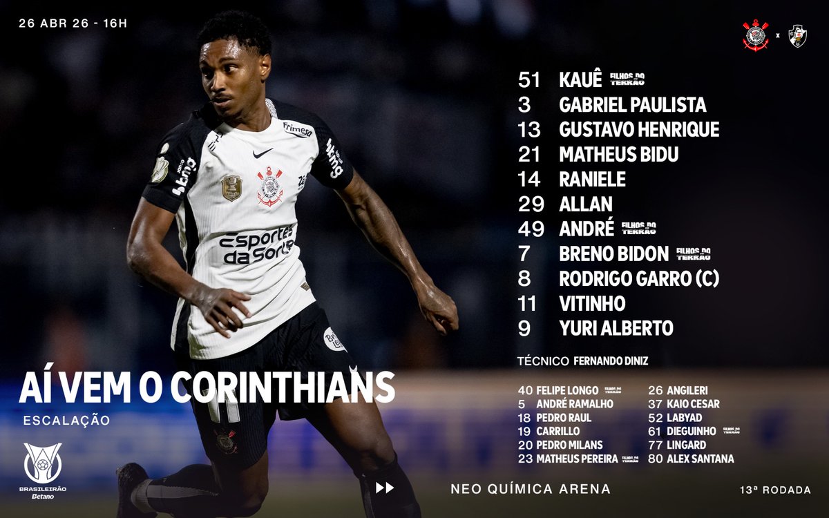 Veja a escalação do Corinthians para o jogo contra o Vasco; ex-vascaíno Pedro Raul é opção no banco
