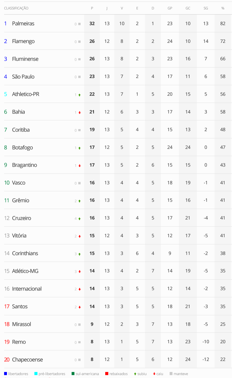 Terminada a 13ª rodada do Campeonato Brasileiro, o Vasco, que perdeu para o Corinthians por 1 a 0, está na 10ª colocação. O Gigante da Colina está a 6 pontos do G5 (zona de classificação à Libertadores) e a 2 pontos do Z4 (zona do rebaixamento).